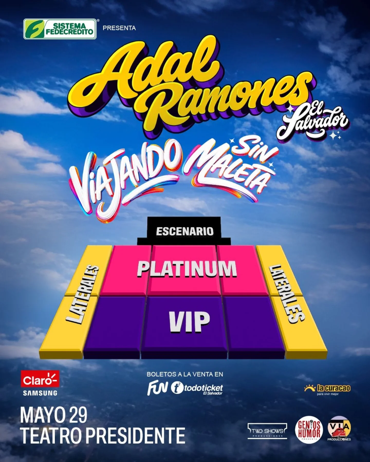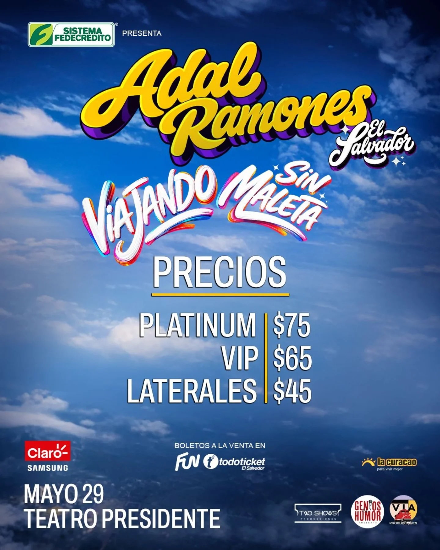 « Todos los Eventos Adal Ramones mayo 29 @ 8:30 pm - 11:30 pm « Alejandro Fernández Iron Maiden » LOCALIDADES PRECIOS COMPRAR Añadir al calendario Google Calendar iCalendar Outlook 365 Outlook Live Detalles Fecha: mayo 29 Hora: 8:30 pm - 11:30 pm Web: https://adalramones.funcapital.com/ Local Teatro Presidente Avenida De La Revolucion &, Calle Circunvalacion San Salvador, San Salvador Organizador Two Shows Ver la web Organizador