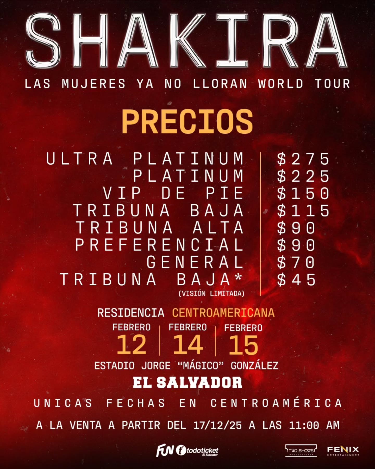« Todos los Eventos Este evento ha pasado. Shakira febrero 12 @ 8:30 pm - febrero 15 @ 11:30 pm « Shakira 7 y 8 María León & Yahir » LOCALIDADES UBICACIONES COMPRAR Añadir al calendario Google Calendar iCalendar Outlook 365 Outlook Live Detalles Comienza: febrero 12 @ 8:30 pm Finaliza: febrero 15 @ 11:30 pm Web: https://shakira.funcapital.com/ Local Estadio Nacional Jorge «El Mágico» González 49 Av Sur, San Salvador San Salvador, San Salvador El Salvador Ver la web Local Organizador Two Shows Ver la web Organizador